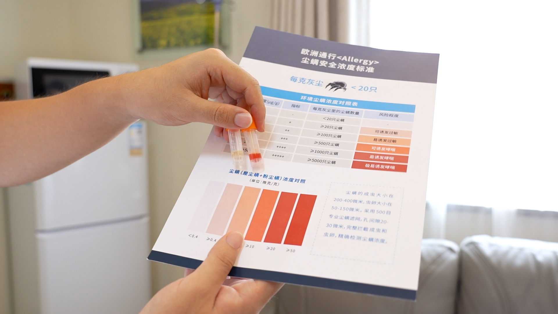 现场模拟了日常居家的场景,分别对床单和抱枕进行了尘螨检测实验,结果显示,实验床单的尘螨浓度在2μg/g以下,诱发哮喘的风险为较低水平;实验抱枕的尘螨浓度在≥20μg/g,风险程度为“易诱发哮喘”。
