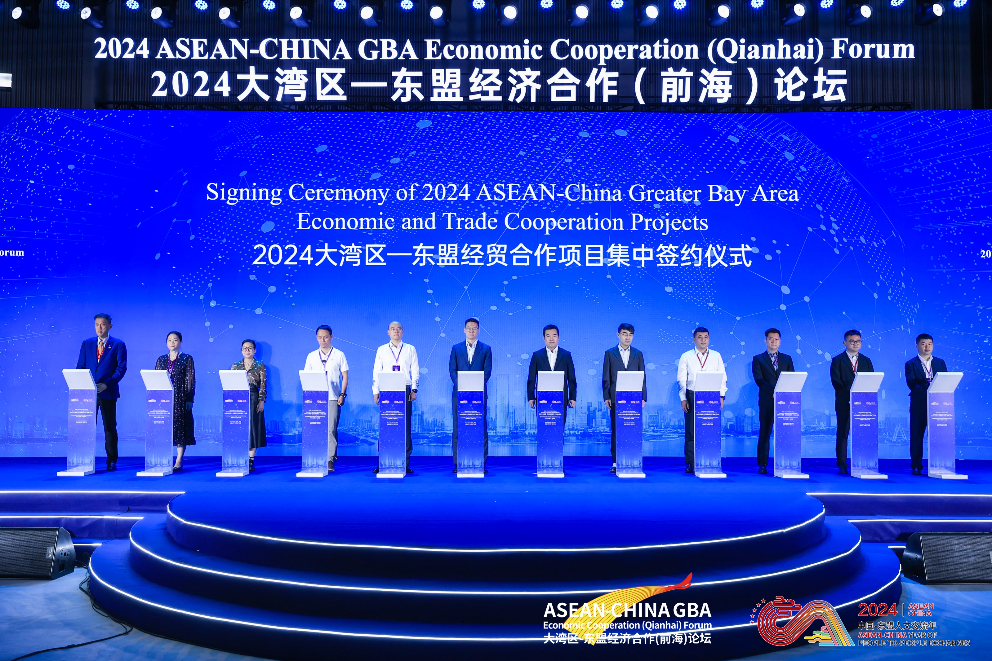 在随后进行的2024年大湾区-东盟经贸合作项目集中签约仪式上,来自粤港澳大湾区和东盟的企业、商会代表完成了15个项目的签约,签约金额共299.9亿元人民币。