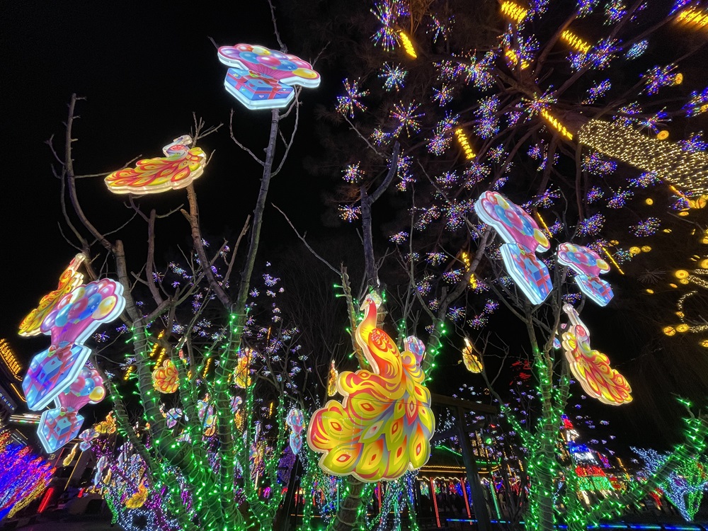 花灯区占地19万平方米,是本届嘉年华的一大亮点。8组大型灯光雕塑、50组绚丽花灯、2000棵树灯以及万盏装饰照明灯交相辉映,将夜晚的龙庆峡装扮得璀璨夺目。特别是北山山体上的《火焰山》造型灯光与裸眼3D山体投影秀,更是为游客带来了一场震撼的视觉盛宴。