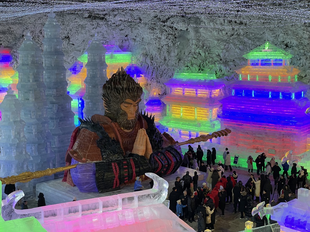 冰灯艺术区作为嘉年华的核心区域,占地面积8000平方米,展示了350件冰灯作品、240件冰雕作品和80件雪雕作品。这些作品在传统冰灯艺术的基础上,巧妙融合了泡泡玛特、西游、仙侠等热门IP元素,以Q萌、奇幻的形象营造出浓厚的幸福愉悦氛围。整个区域精心规划为五大主题区:蛇年贺新春区以生肖“蛇”为核心,展示了灵蛇、五行龙小侠等Q萌形象;泡泡玛特区以迷宫为载体,配备互动冰滑梯,成为游客们的网红打卡点;西游文化区通过冰雕冰灯展现了南天门、大型冰悟空等经典场景;仙侠文化区则重现了蜀山浮空城、仙剑城等仙侠建筑;冰川飞瀑区在往届基础上新增气膜灯与精品雪雕,为游客带来前所未有的视觉体验。