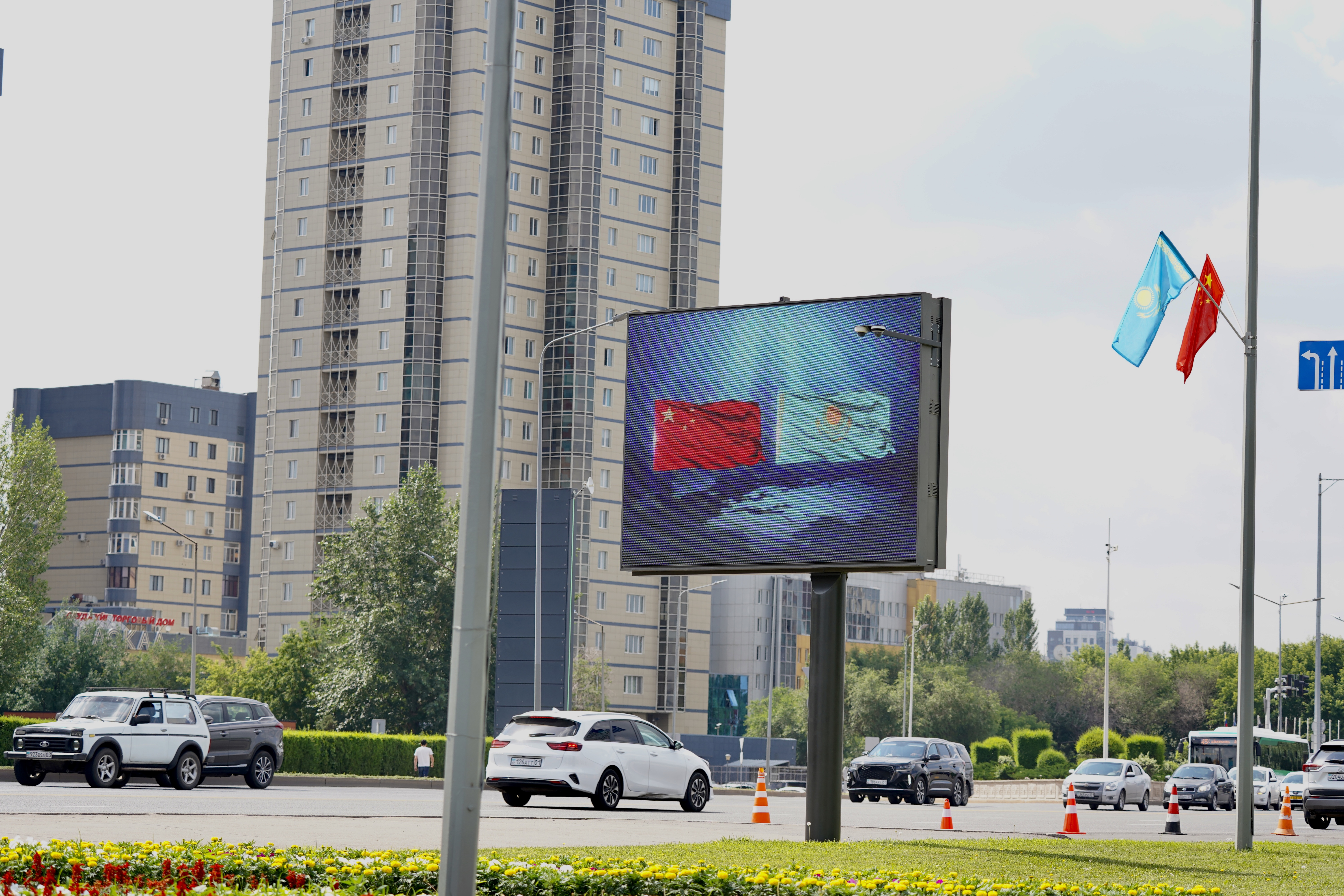 阿斯塔纳街头,电子屏播放中哈两国国旗。本报记者 巩晗 摄
