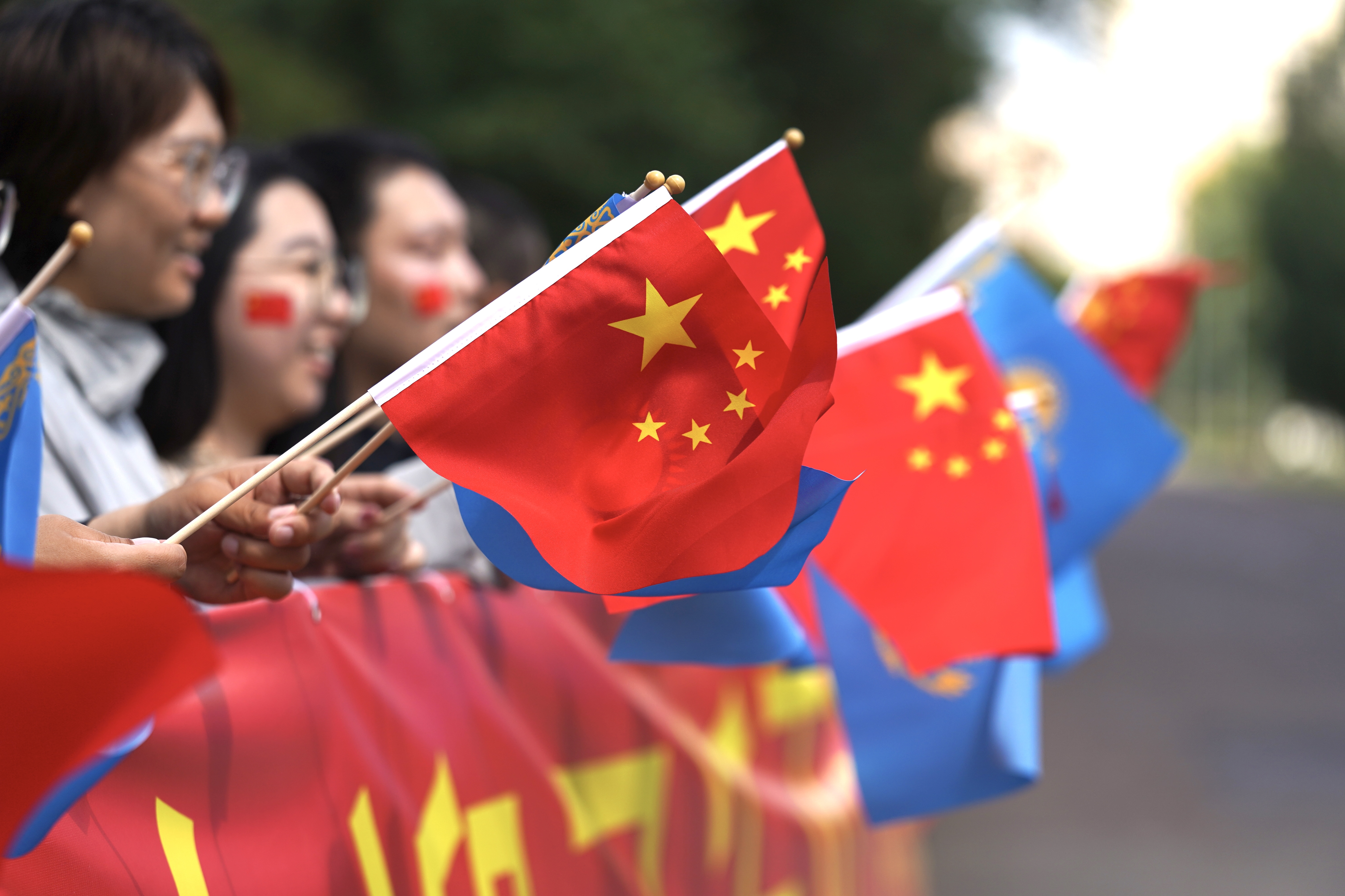 欢迎人群挥舞中哈两国国旗,热烈欢迎习近平主席。本报记者 巩晗 摄