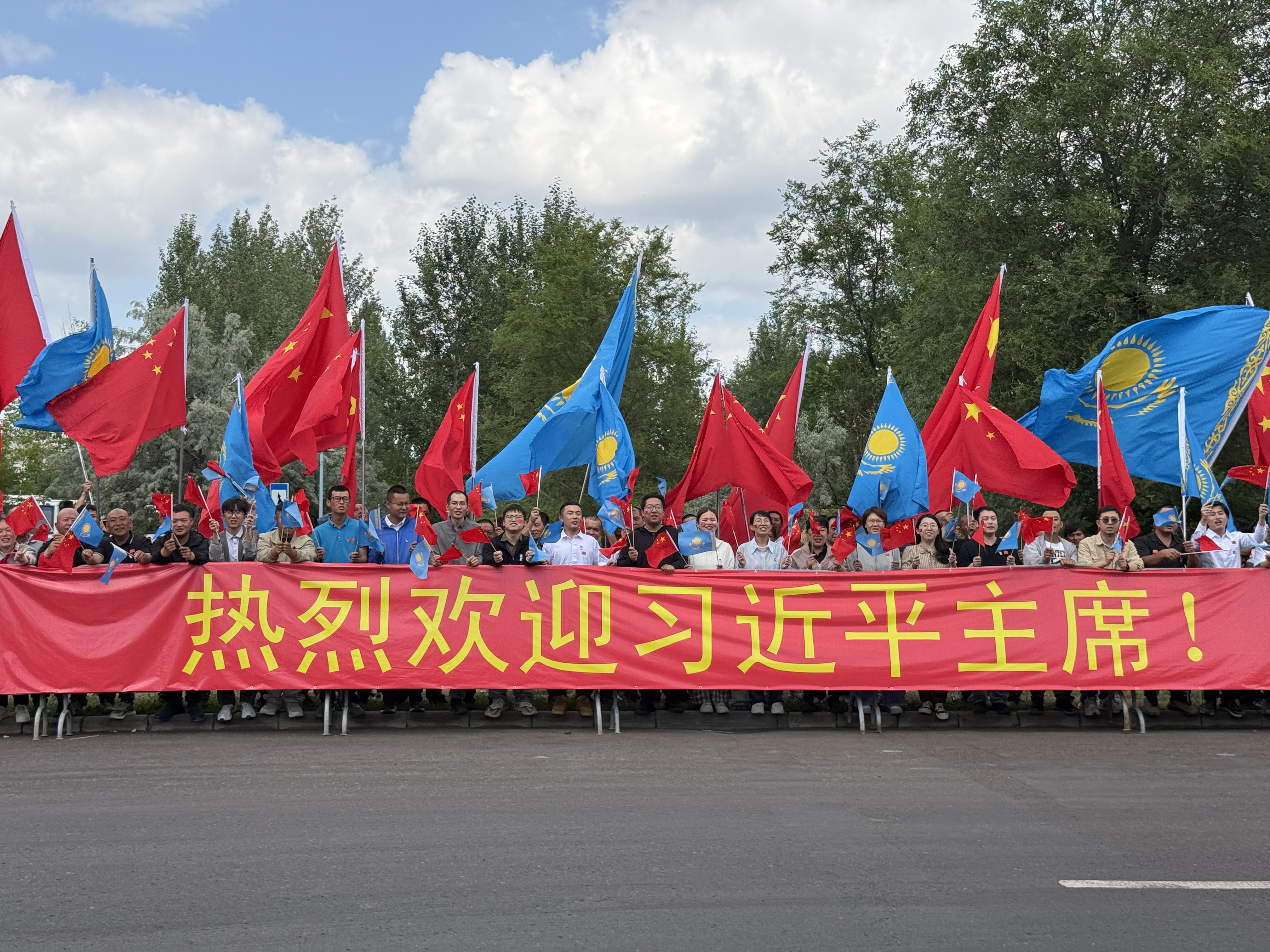 当地时间6月16日中午,国家主席习近平乘专机抵达阿斯塔纳,应哈萨克斯坦共和国总统托卡耶夫邀请,出席第二届中国—中亚峰会。习近平主席乘车从机场赴下榻饭店途中,中资企业和留学生代表聚集在道路两旁,手持“热烈欢迎习近平主席!”“中哈友谊万岁!”等红色横幅,热烈欢迎习近平主席到访。