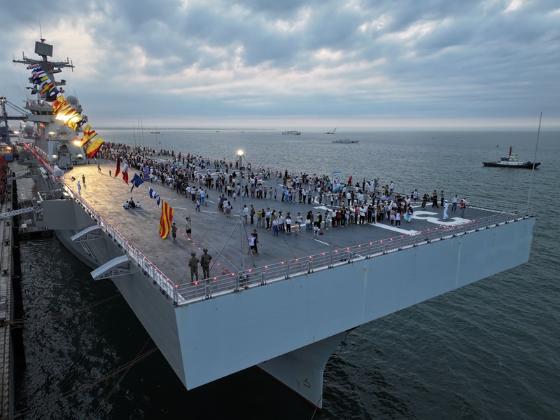 一位参战老兵受邀登舰参观。当舰员搀扶他登上海南舰,他颤抖地抚摸着甲板栏杆,眼眶湿润:“当年我们打海战用的还是小艇,如今亲眼见证有了万吨巨舰,我这辈子值了!”海南舰官兵握住他的手郑重承诺:“前辈,我们会替您守好这片海!”