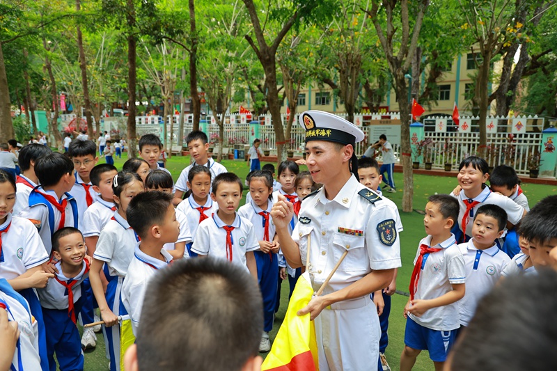 相距仅50公里的海口市秀英港内,海军五指山舰20名官兵身着洁白军装走下舷梯,奔赴五指山市。在五指山革命根据地纪念园23米高的纪念碑前,官兵聆听琼崖纵队武装斗争“二十三年红旗不倒”的光辉历史和“孤岛不孤”的革命奇迹;在五指山市第一小学,五指山舰军士马玉婷以“人民海军向海图强的发展成就”为主题,为翘首以盼的学生们带来一堂生动的国防教育课。