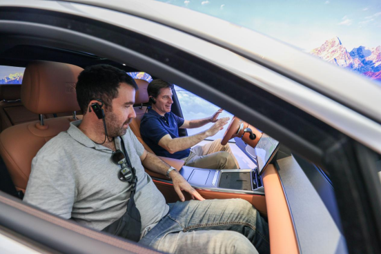 9月14日,考察团成员在比亚迪西安研发中心展厅内体验模拟驾驶系统。张武军摄