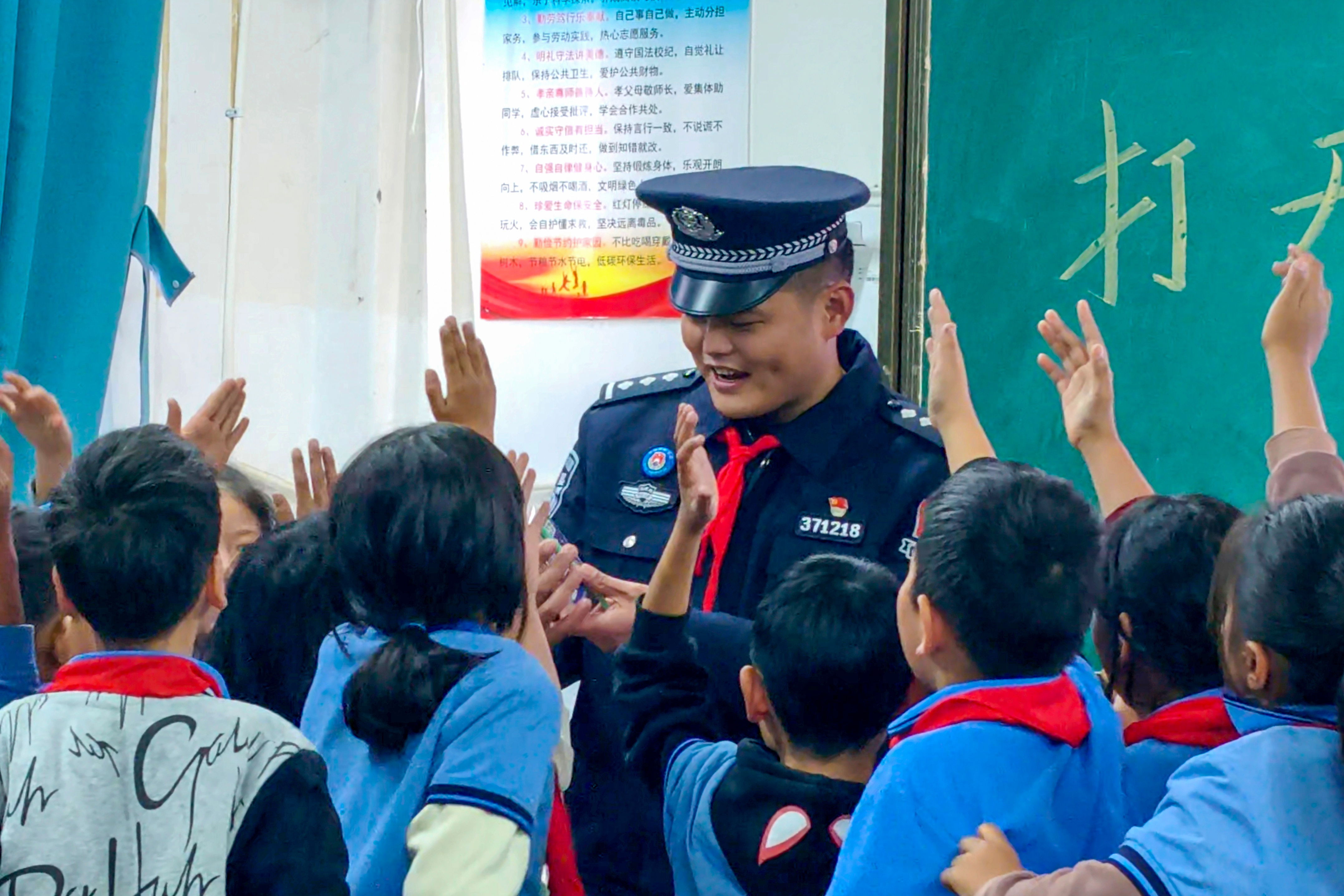 “同学们,我们今天继续学习安全防护小知识……”尹中山站上讲台,习惯性地伸手拉开黑板,当黑板缓缓移动,一张精美的PPT把尹中山愣在原地——“警察叔叔:警察节快乐!”PPT的边框里,还画着民警和孩子们在花草中游玩的场景……