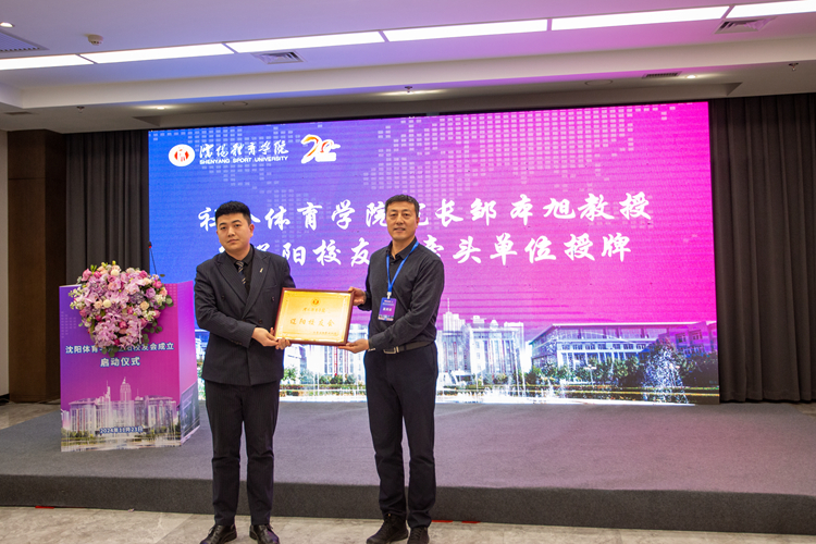 沈阳体育学院社会体育学院院长邹本旭为辽阳校友会牵头单位授牌。