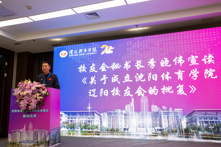 沈阳体育学院校友会秘书长季晓伟宣读《关于成立沈阳体育学院辽阳校友会的批复》。