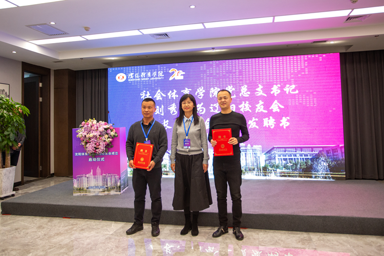 沈阳体育学院社会体育学院党总支书记刘秀红为辽阳校友会会长、副会长颁发聘书。
