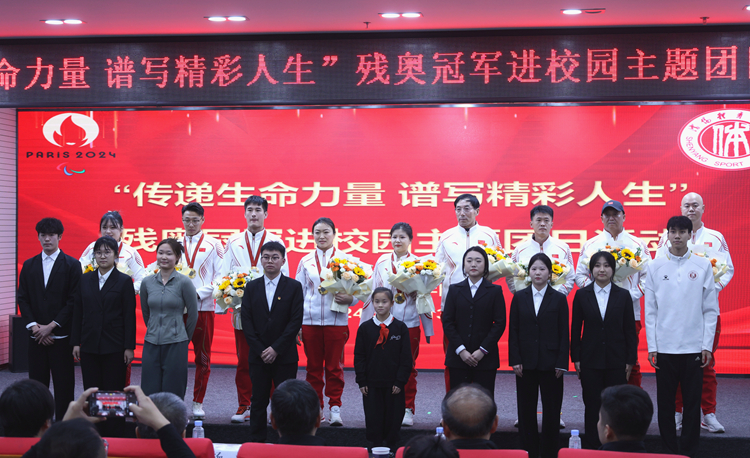 来自各院、校、部学生代表向残奥冠军和功勋教练献上鲜花以示敬意