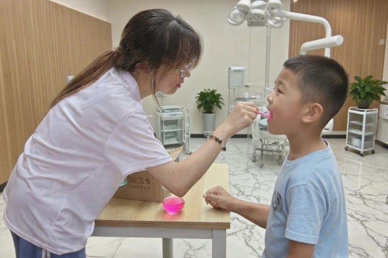 (图注: 队员邀请孩子们亲身体验牙菌斑指示剂)