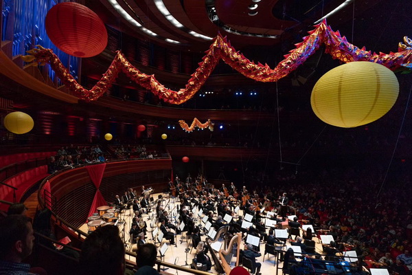 拥有2500个座位的音乐厅上空悬挂着两条中国龙,费城交响乐团和远道而来的上海爱乐乐团同台,联袂奏响了“费城首届中国新年音乐会”。