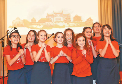 2019年2月8日,在意大利拉齐奥的古镇蒂沃利,蒂沃利国立住读学校的学生们在中国春节庆祝活动上给大家拜年。