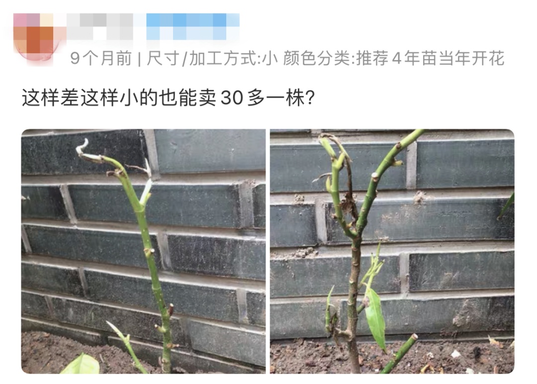 但记者点开后却发现不少消费者晒出的图片却是没有叶子的光杆。在该店的商品选项中,是按花苗的年龄来区分的,一位3钻消费者晒出一根近乎光杆的照片质疑道:“买的是8年苗,虽然不太懂,但也不相信这是8年苗,叶子就那么五六片……”