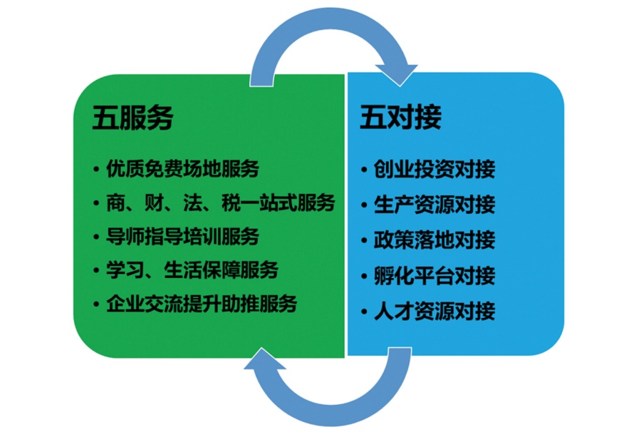 所谓“双五”,就是创新创业园打造的优质免费场地服务等“五服务”和创业投资对接等“五对接”,为学生创业提供全过程、全要素、全方位服务。