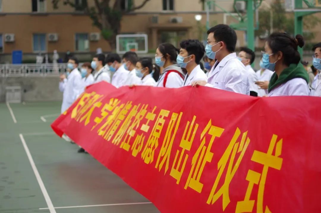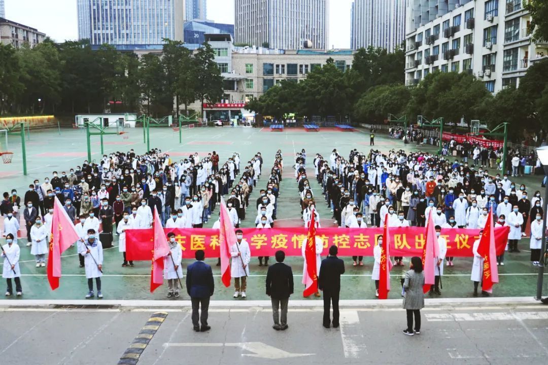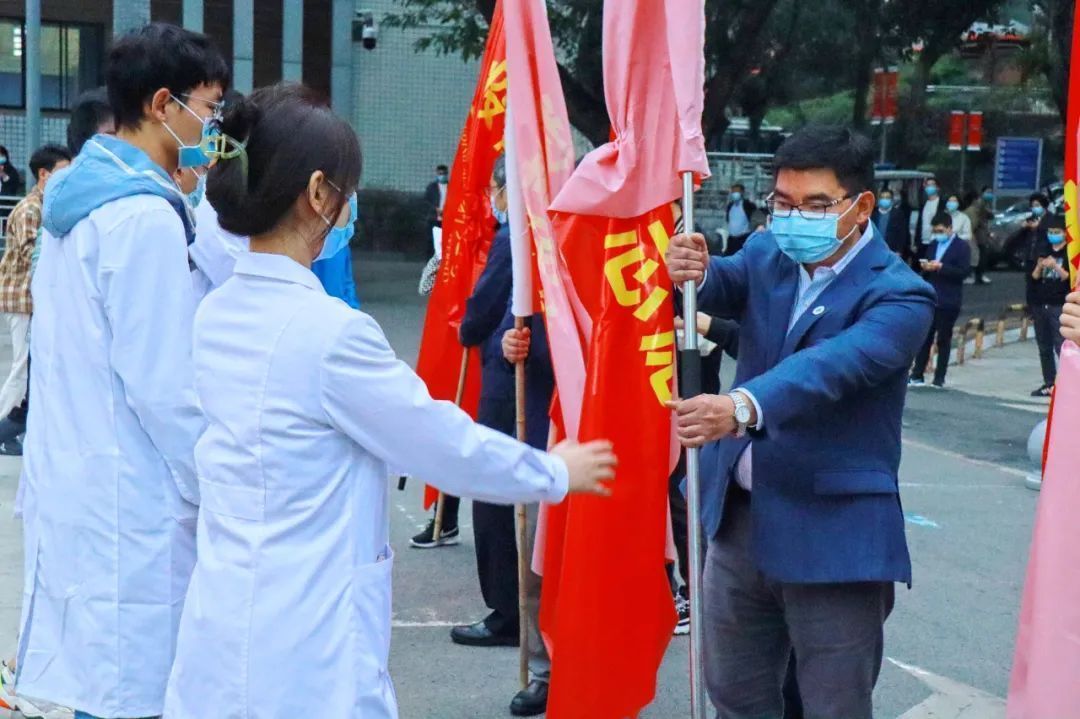 重庆医科大学党委书记覃正杰,校长黄爱龙,副校长杨竹,校党委常委、副校长袁军举行出征仪式为志愿者们送行,杨竹主持仪式。