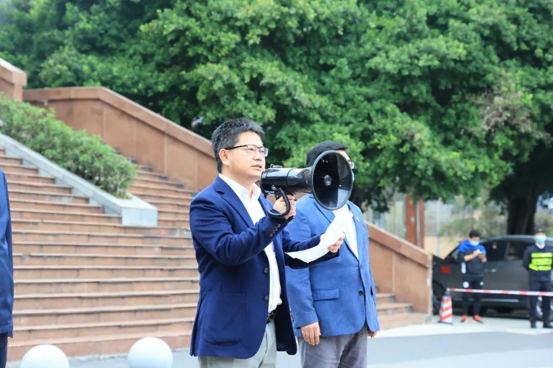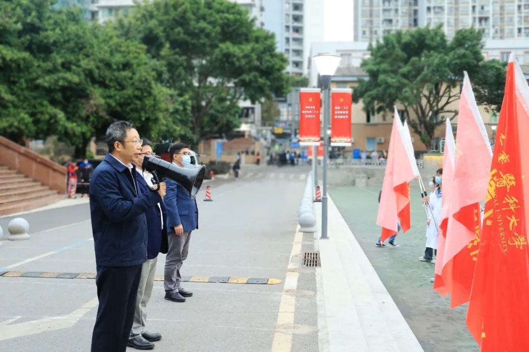 黄爱龙作动员讲话,他说:“从血吸虫病,到非典,再到新冠肺炎疫情,重医人始终冲锋在抗疫斗争第一线!”他希望志愿者们用接续奋斗传承抗疫基因,用担当作为守护人民健康,坚决保卫大重庆家园!黄爱龙对大家提出三点要求,要牢记重医人的身份与荣光,传承西迁精神和抗疫精神,书写青春战疫篇章;要坚持生命至上、人民至上,践行医学生誓言,同心抗疫、共克时艰;要加强自我防护,体现专业水平,早日平安凯旋!