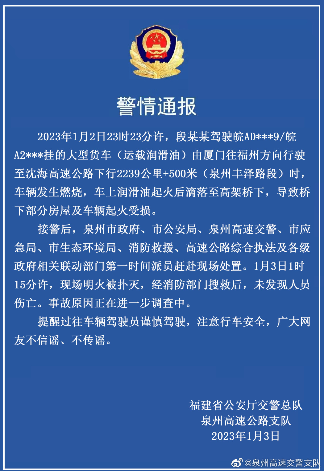 1月3日凌晨,泉州高速交警支队发布警情通报称沈海高速公路下行2239公里+500米(泉州丰泽路段) ,一辆运载润滑油的大型货车发生燃烧,车上润滑油起火后滴落至高架桥下,导致桥下部分房屋及车辆起火受损。目前,现场明火已被扑灭,经消防部门搜救后,未发现人员伤亡。事故原因正在进一步调查中。通报全文如下:
