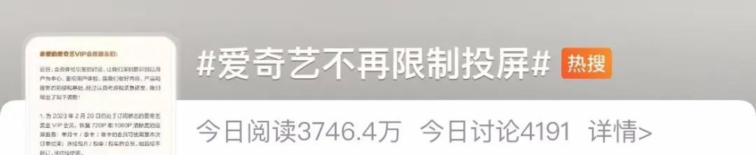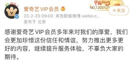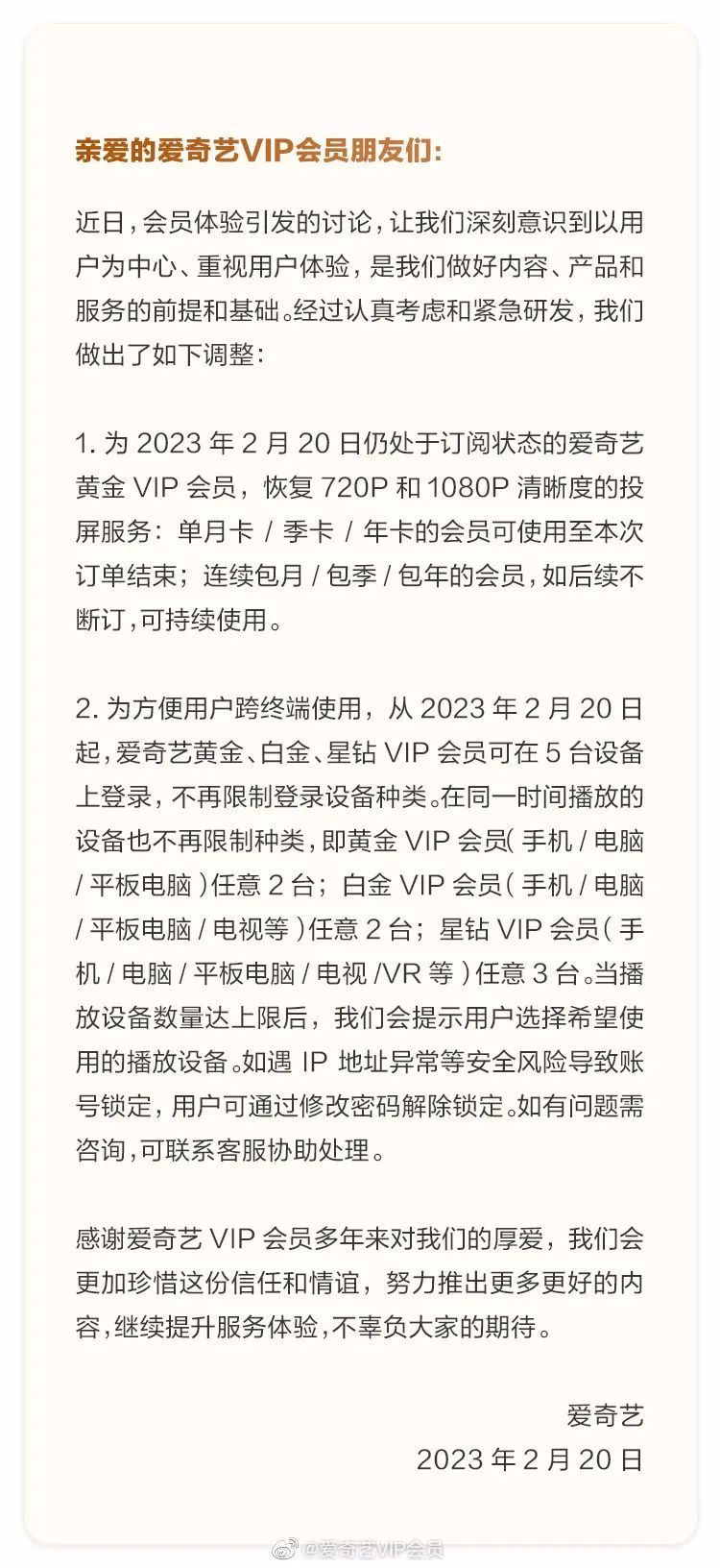 2月20日上午9时,爱奇艺通过官方微博@爱奇艺VIP会员发布关于爱奇艺会员服务优化情况说明,针对投屏服务、登录设备规则做出了如下调整: