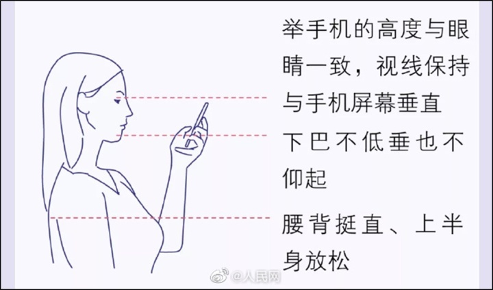 3、半卧位看手机时,维持头部抬起的肌肉用力较少,但长时间低头看手机,也是容易造成头颈部疼痛。可将手机举起来,保证头部与身体在一条直线上,也要注意支撑腰部。