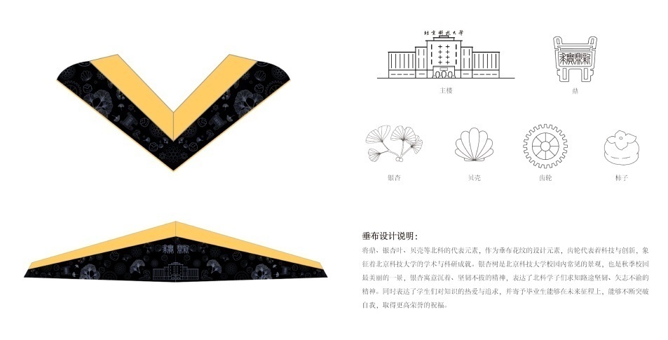 垂布上的图案融合了贝壳、银杏、齿轮等元素,承载着北科学子的校园记忆,也寄予每一位毕业学子在未来的路上保持热爱、奔赴山海。