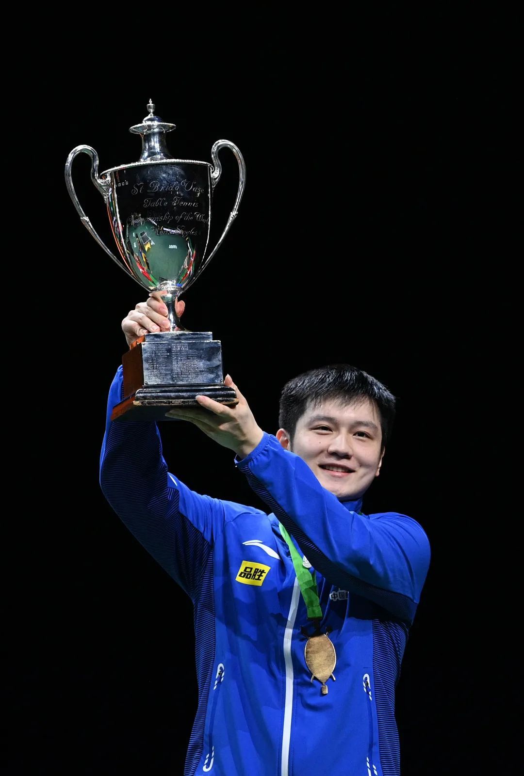 两年后,笑谈成了真。这一次,樊振东站在德班的最高领奖台上,稳稳地举起圣·勃莱德杯,展现自己难以撼动的强大实力。