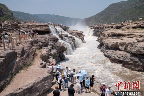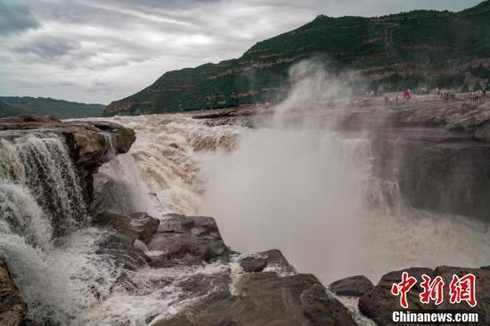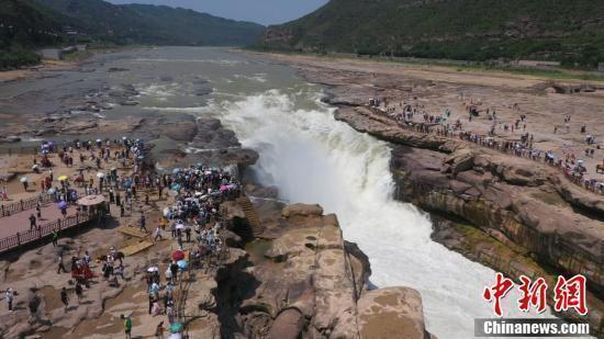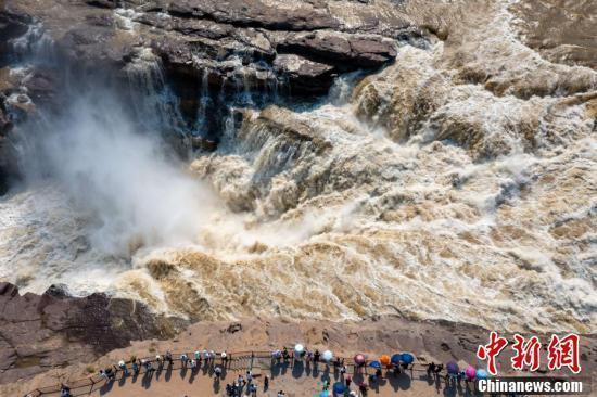 随着黄河上游近期降雨增多,位于秦晋大峡谷的黄河壶口瀑布水位上升,从空中俯瞰,壶口主瀑布波涛汹涌,激起一片白色水雾和烟云。近年,黄河流域生态环境治理力度不断加大,黄河水质由浊变清,出现清流飞瀑的独特景观,吸引各地游客纷至沓来。