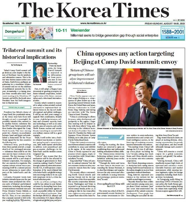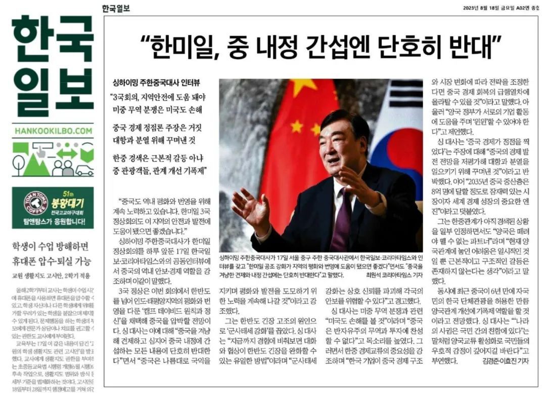 8月18日,《韩国日报》《韩国时报》刊登对邢海明大使的联合专访。邢海明大使在采访中回顾中韩建交31周年来的发展成就,展望两国关系未来发展方向,并就中韩经贸合作、中国经济形势、韩美日领导人会谈、中国公民赴韩团队游等问题回答记者提问。采访全文如下: