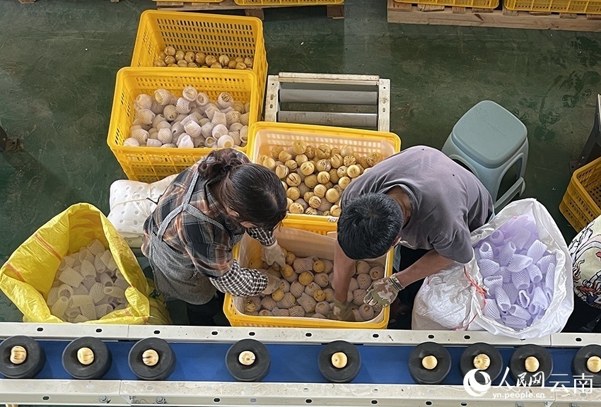 务工人员将人参果放上托盘进行机器分拣。人民网记者 程浩摄