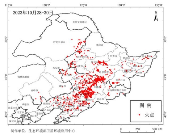 图为10月28—30日东北地区秸秆焚烧火点分布图
