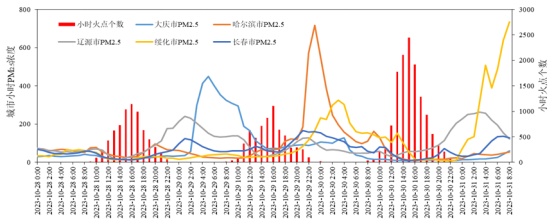 图为10月28日0时—31日8时,哈尔滨及周边城市PM2.5浓度以及东北40城市秸秆焚烧小时火点个数变化情况。