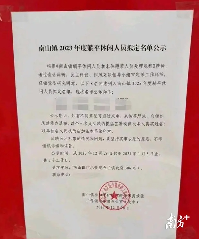 公示显示,根据《南山镇躺平休闲人员和末位鞭策人员处理规程》,通过谈话调研、民主评议、作风效能领导小组审定等工作环节,经南山镇党委研究同意,8名同志列入南山镇2023年度躺平休闲人员拟定名单。据悉,这在南山镇属首次。