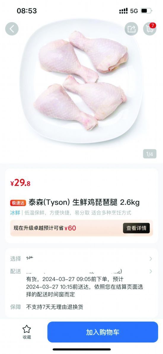 记者将配送地址切换至上海后,显示泰森生鲜鸡琵琶腿有货,当天就可送达,售价依然是29.8元。之后,记者又尝试将地址切换至成都,该地区销售的泰森生鲜鸡琵琶腿规格为1.2kg每盒,售价35.9元,换算单价后,是上海店的2.6倍。