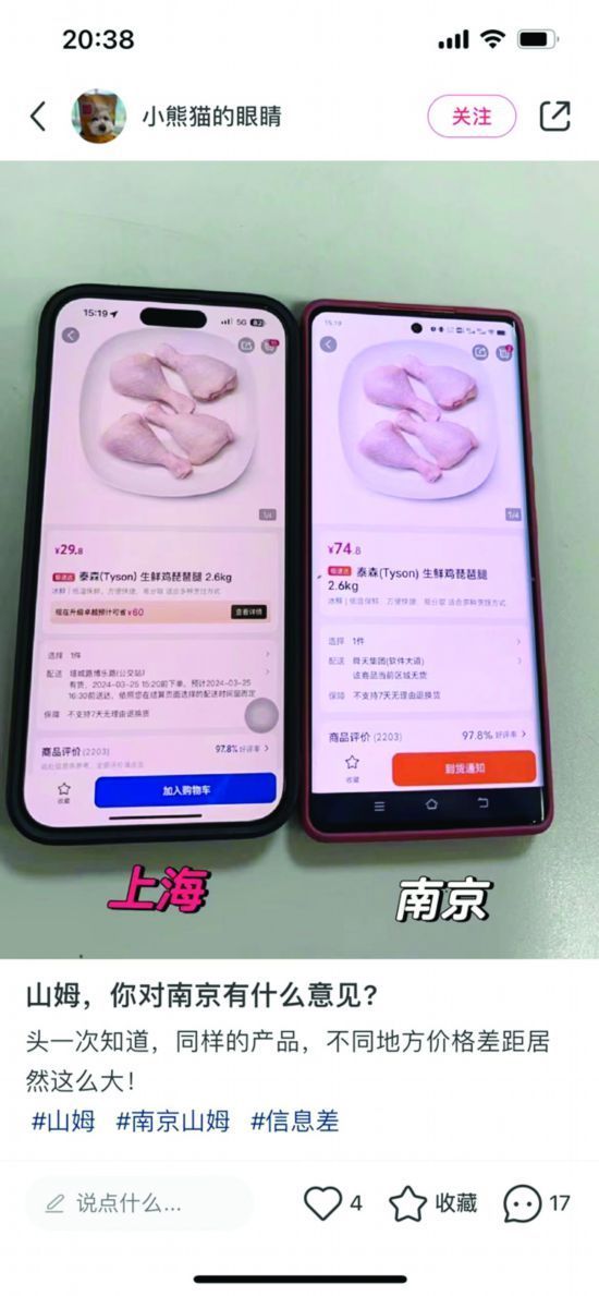 同样品牌的鸡腿,不同地区的差价达到1.5倍之多。山姆客服解释说,商品实际销售中,受不同城市成本、市场环境、优惠活动等影响,在不同城市的价格也会有些许不同。对此,很多网友认为,物流、仓储等等会影响成本,但上海、南京距离不远,物流便捷,1.5倍的差价实在过于离谱了。