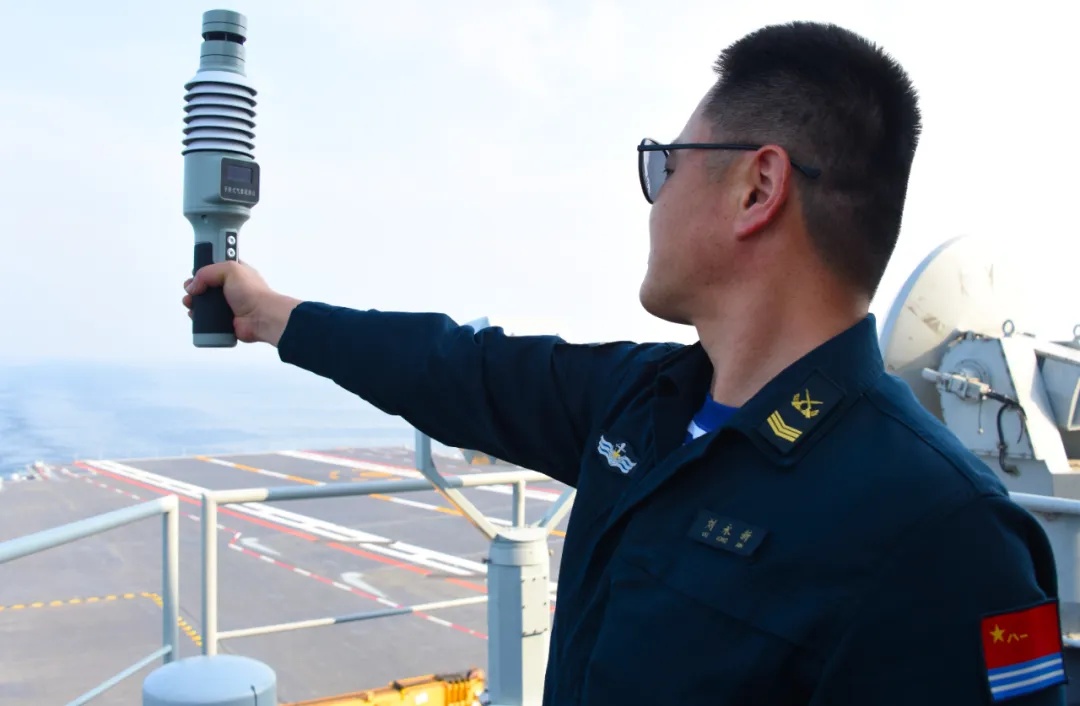 这是中国海军福建舰上的气象水文部门人员在海上进行人工气象探测(5月7日摄)。新华社记者 黎云 摄