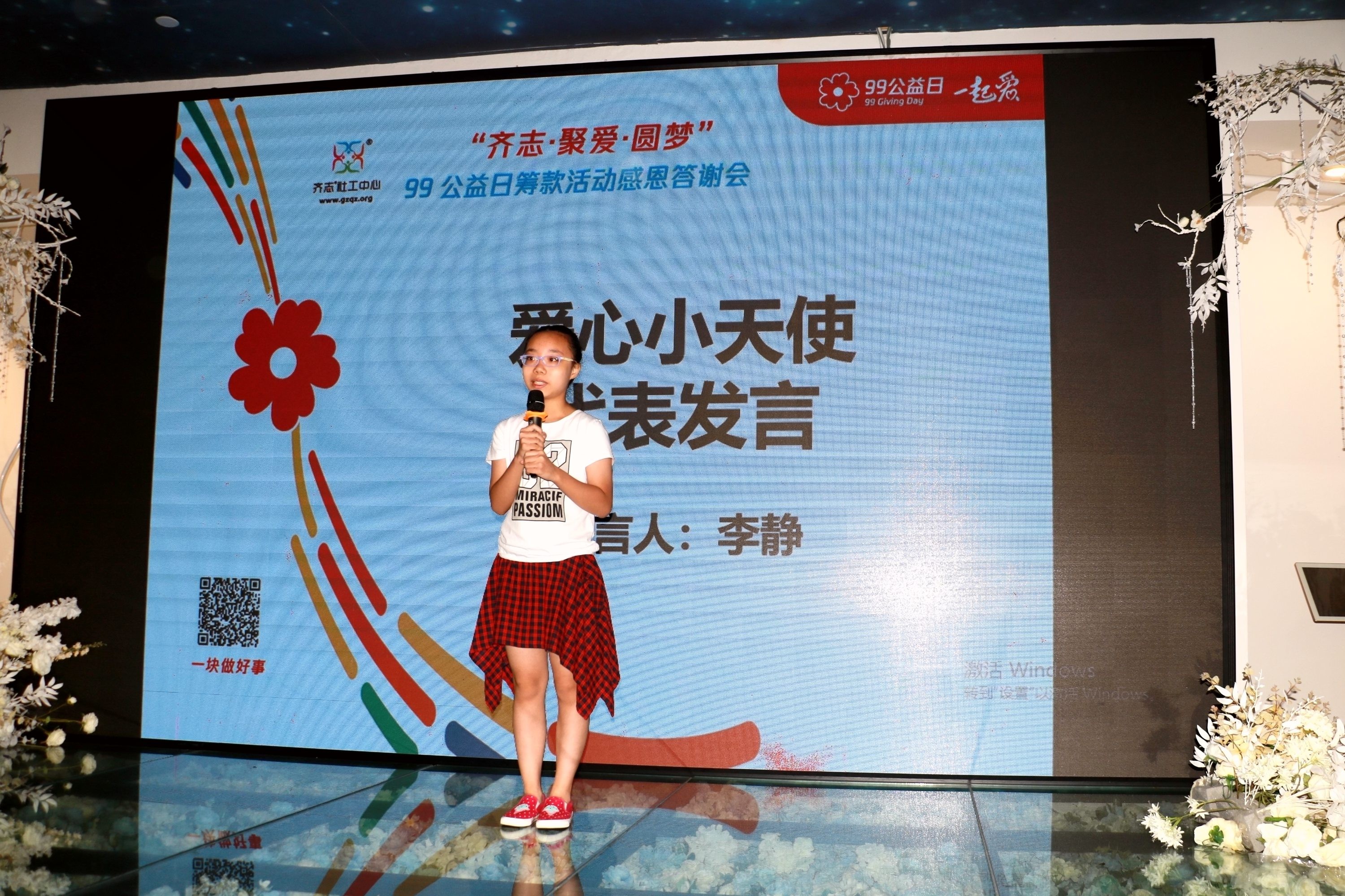 优秀爱心小天使代表李静代表分享到:“以前,我不知道做志愿者有什么意义,有次齐志的志愿者吴笑容阿姨来到我们家问我有什么“微心愿”,才知道原来做志愿者是为了帮助更多有需要帮助的人,我很想当志愿者,一直没有机会,齐志举办的99公益日线下筹款活动,我终于当上了齐志志愿者,可以为齐志出一份力,为更多的困境儿童出一份力,能当上齐志志愿者,我感到很骄傲、很自豪,很开心。”