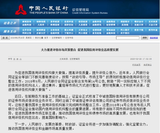 近日,中国证监会依法核准中诚信国际信用评级有限责任公司(简称“中诚信国际”)证券市场资信评级业务许可,同时注销中诚信证券评估有限责任公司(简称“中诚信证评”)的证券市场资信评级业务许可。中诚信证评的证券市场资信评级业务由中诚信国际承继。这标志着中诚信国际与中诚信证评的整合工作已经完成。此次整合是中国人民银行和中国证监会跨市场评级业务资质互认政策出台后的首例机构整合,使中诚信国际实现在银行间债券市场和交易所债券市场全市场开展评级业务。对此,中国人民银行28日在其官方网站发表题为《大力推进评级市场资源整合 促进我国信用评级业高质量发展》的点评。