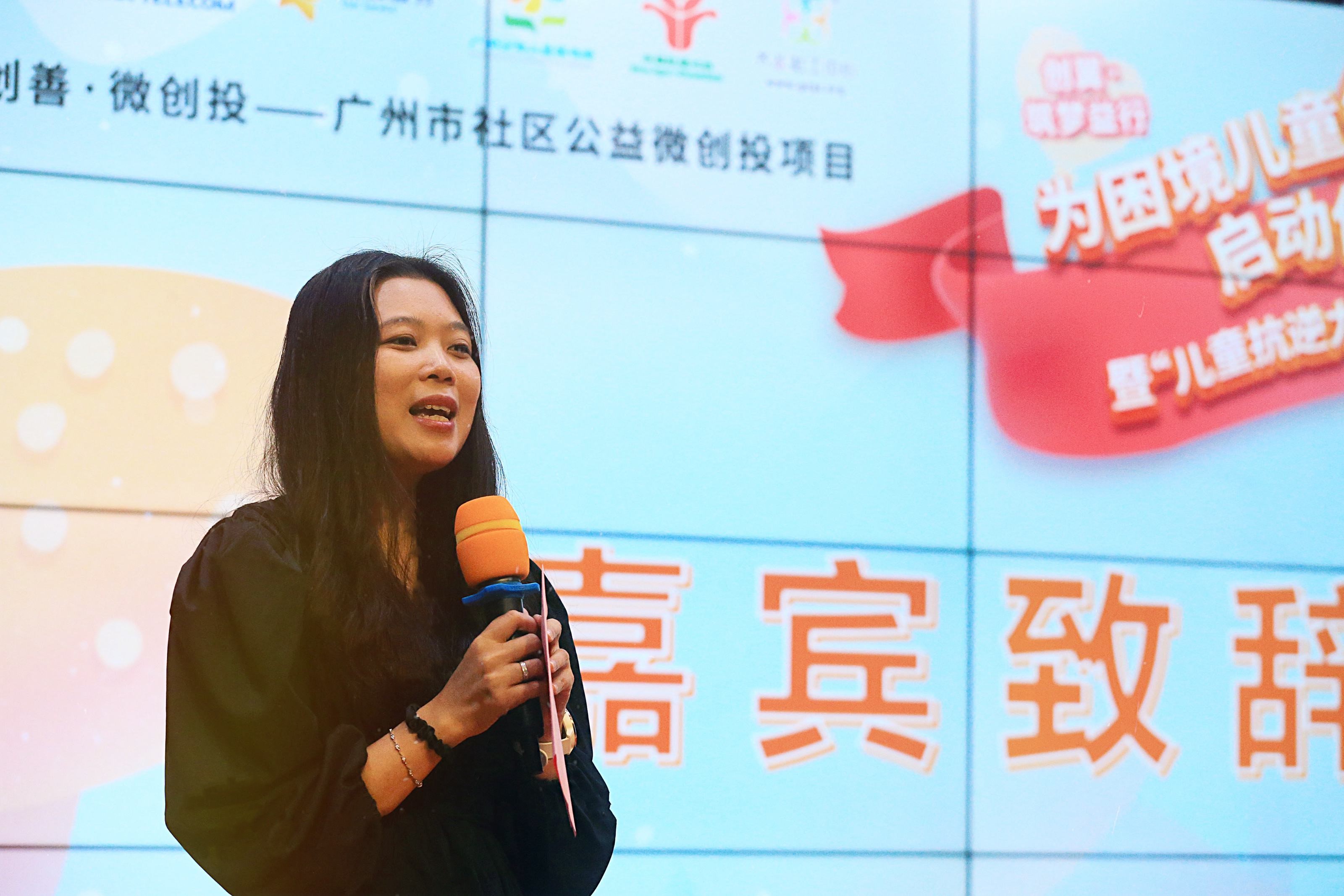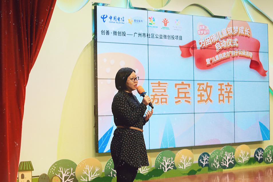 广州市善城社区公益基金会罗莹副秘书长出席启动仪式并为启动仪式致辞,罗莹副秘书长介绍说到:“创善·微创投”广州市社区公益微创投活动是我们基金会今年主要的一个资助项目,希望通过我们对社区服务项目的支持,能够让更多的社会服务机构服务于社区居民。在为困境儿童筑梦成长这个项目上,我们希望通过对齐志的支持,能够让更多的儿童受惠,让儿童快乐健康成长。希望今天的活动能够圆满成功,也希望我们的支持能够让项目更具有生命力和持久力,服务更多有需要的儿童。