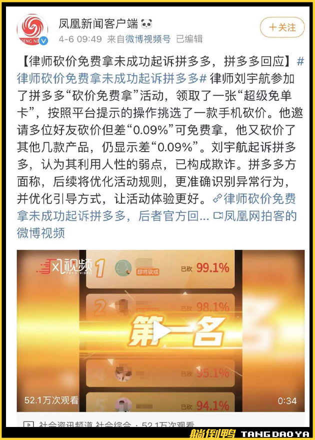 最近,上海的一位律师就以“邀请多人助力砍价免费拿,始终差0.09%”把拼多多起诉了。