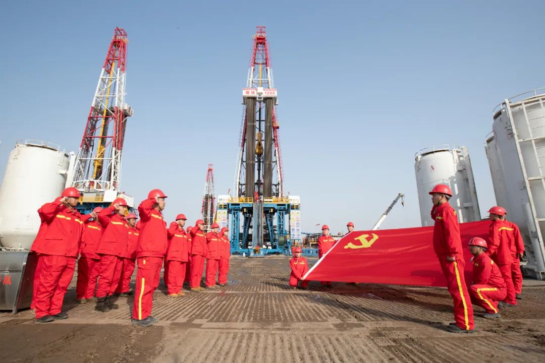 中国石油大庆油田1205钻井队重温入党誓词。大庆油田1205钻井队是“铁人”王进喜带过的队伍,是铁人精神的发源地。