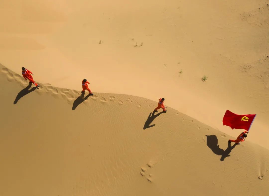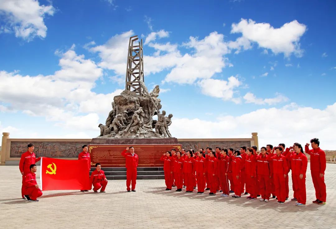 中国石化西北油田科研团队党员在沙参2井纪念碑前重温入党誓词。沙参2井的油气突破是我国海相油气的首次重大发现,拉开了塔里木盆地石油勘探开发会战的序幕。
