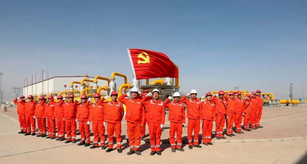 宁夏回族自治区中卫市,国家管网中卫维抢修队职工在亚洲最大的天然气枢纽场站——西气东输中卫压气站重温入党誓词。
