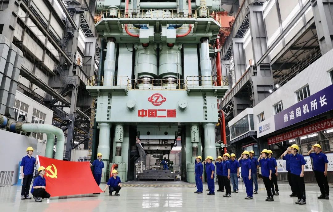国机集团万航模锻党员在当今世界最大、最先进的大型模锻压机——8万吨模锻压力机前重温入党誓词。