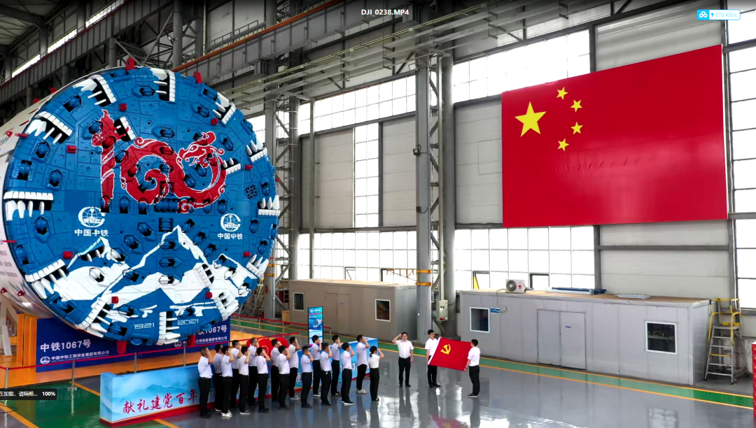 中国中铁装备研发制造国产首台高原高寒大直径硬岩掘进机的设计师和一线工人党员重温入党誓词,他们身后是即将奔赴高原路网建设的“雪域先锋号”。