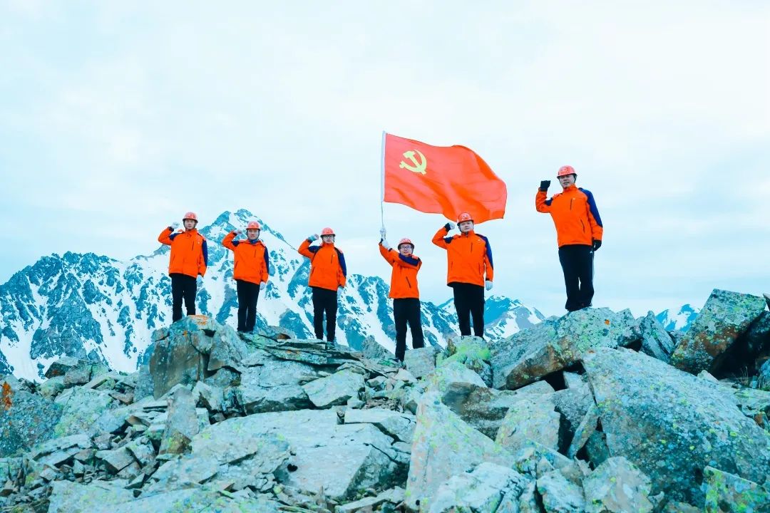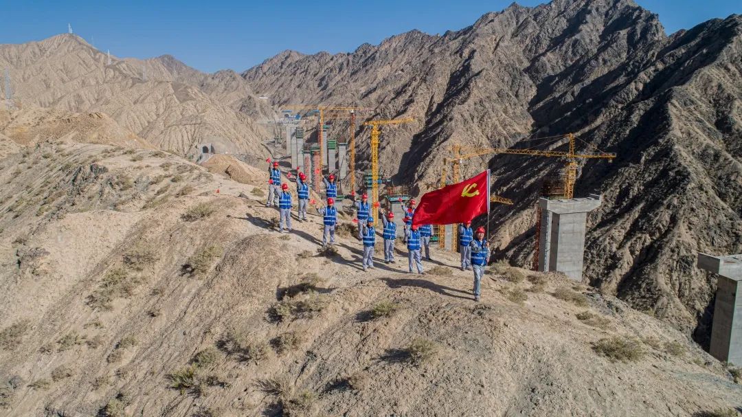 在中交新疆乌尉公路包PPP项目依若高速施工现场,项目党员们挥舞着党旗,向建党百年献礼!