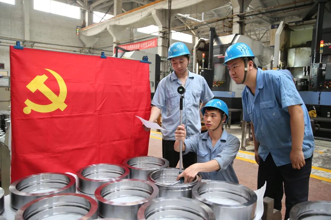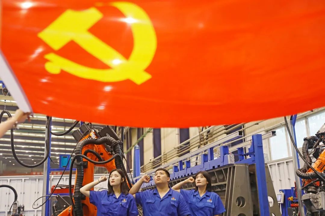 中国船舶渤船集团青年党员在智能制造车间重温入党誓词。渤船集团的的前身是原来的辽宁渤海造船厂,始建于1954年,时称“中国第一造船厂”。