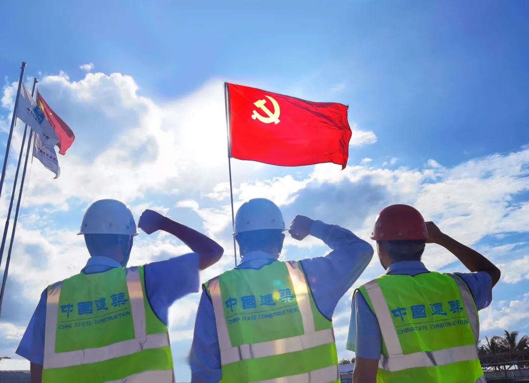 中建集团职工在享有 “中国第一生态园林机场”美誉的海口美兰机场项目驻地重温入党誓词。