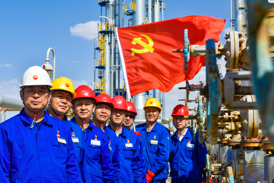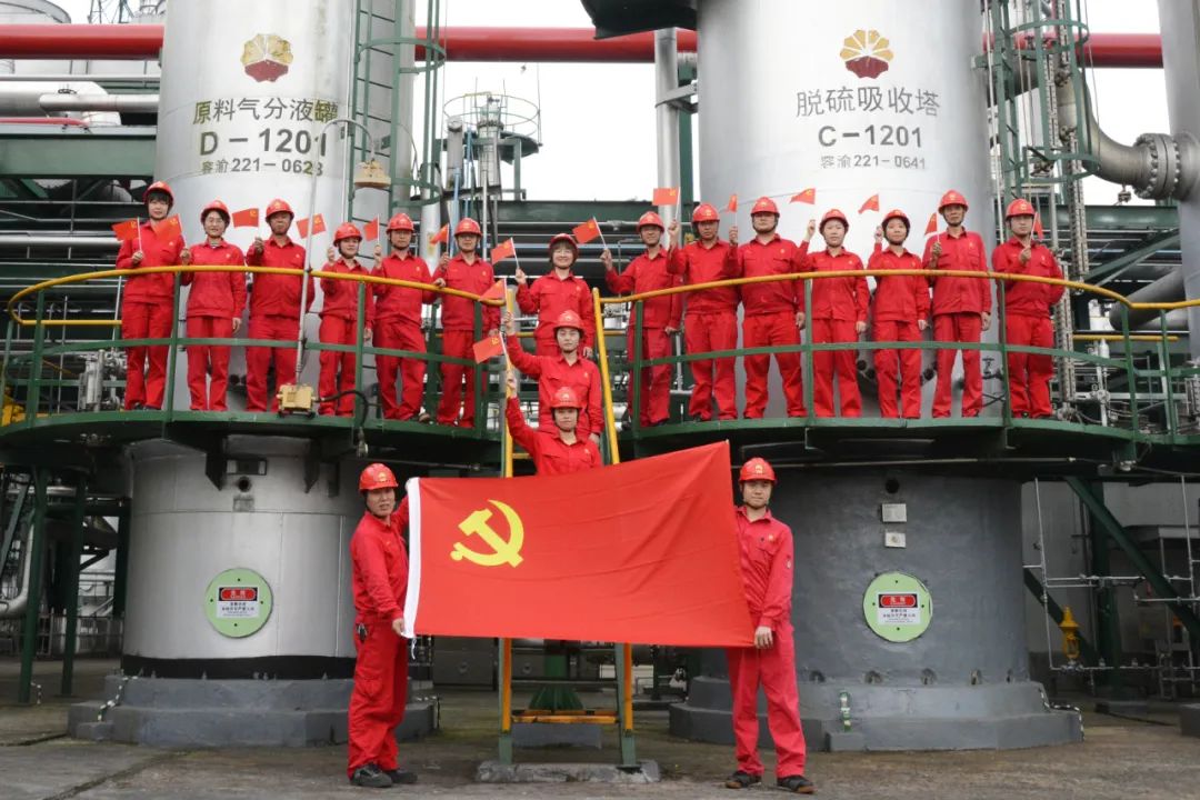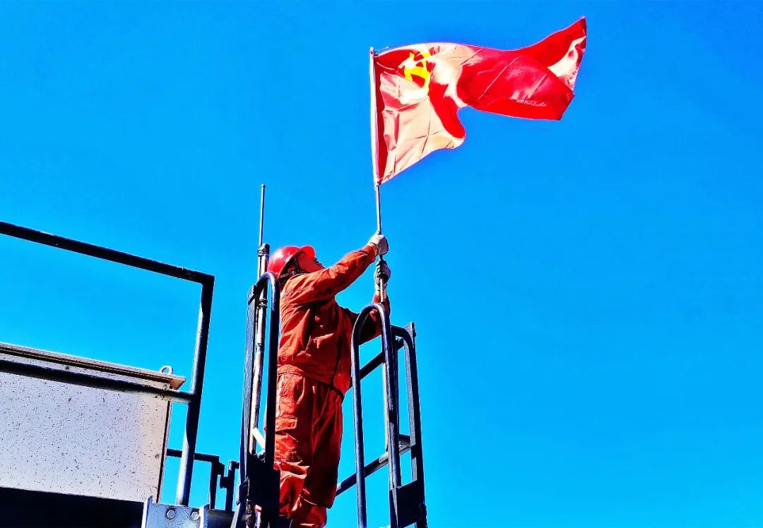 中国石油西南油气田净化厂员工让党旗高高飘扬在生产一线。西南油气田是我国首个天然气产量超百亿的气区。