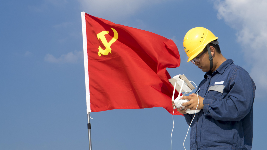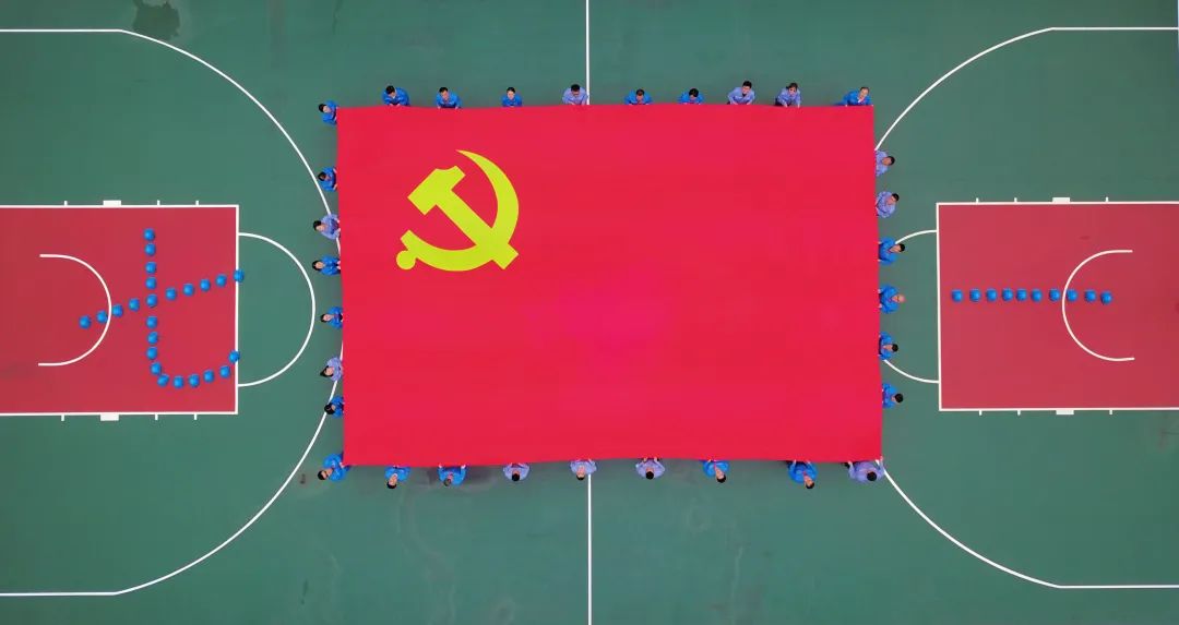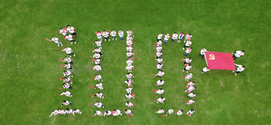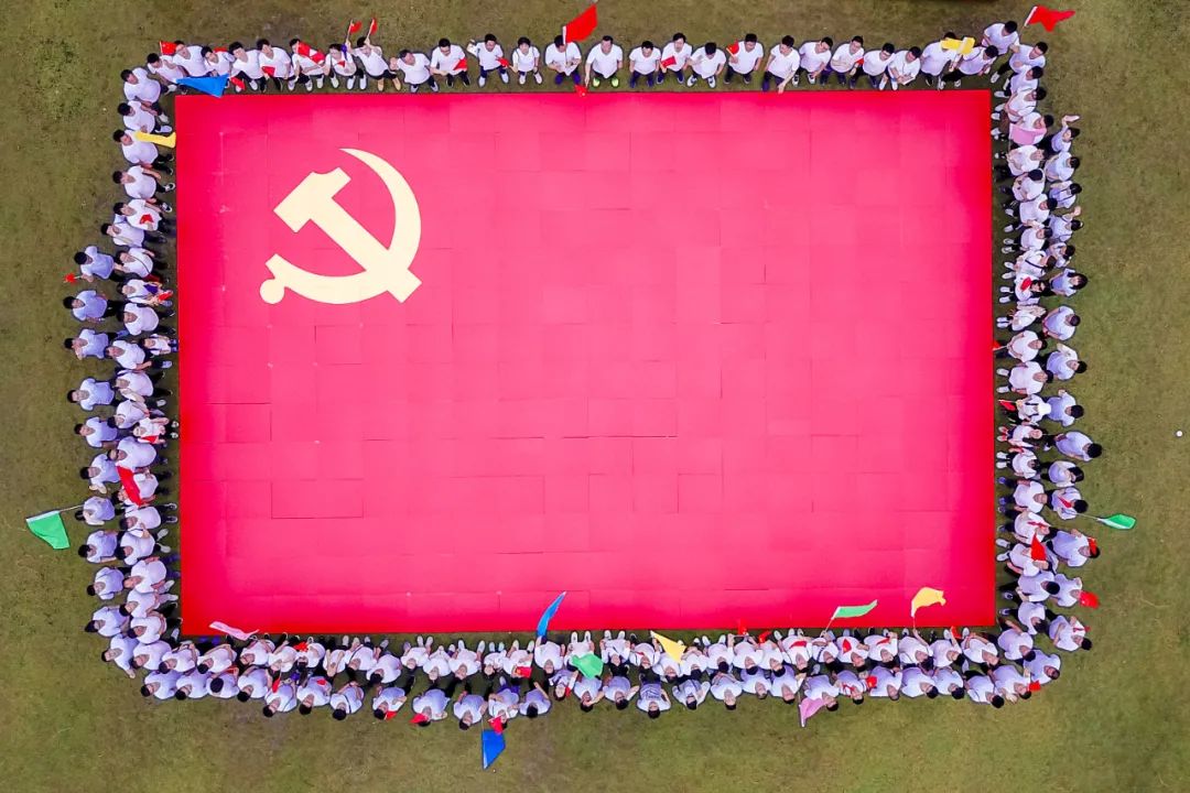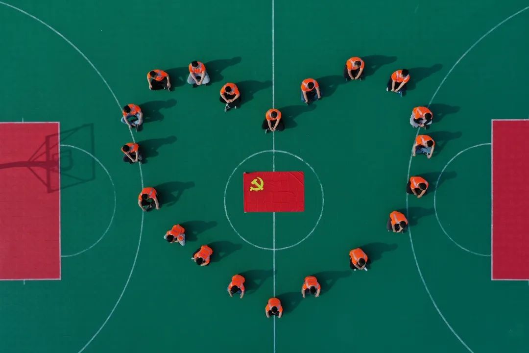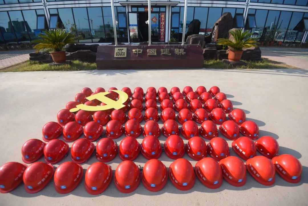 中建集团株洲三一项目的党员及青年职工用红色安全帽拼出一面党旗,迎接党的100周年华诞。